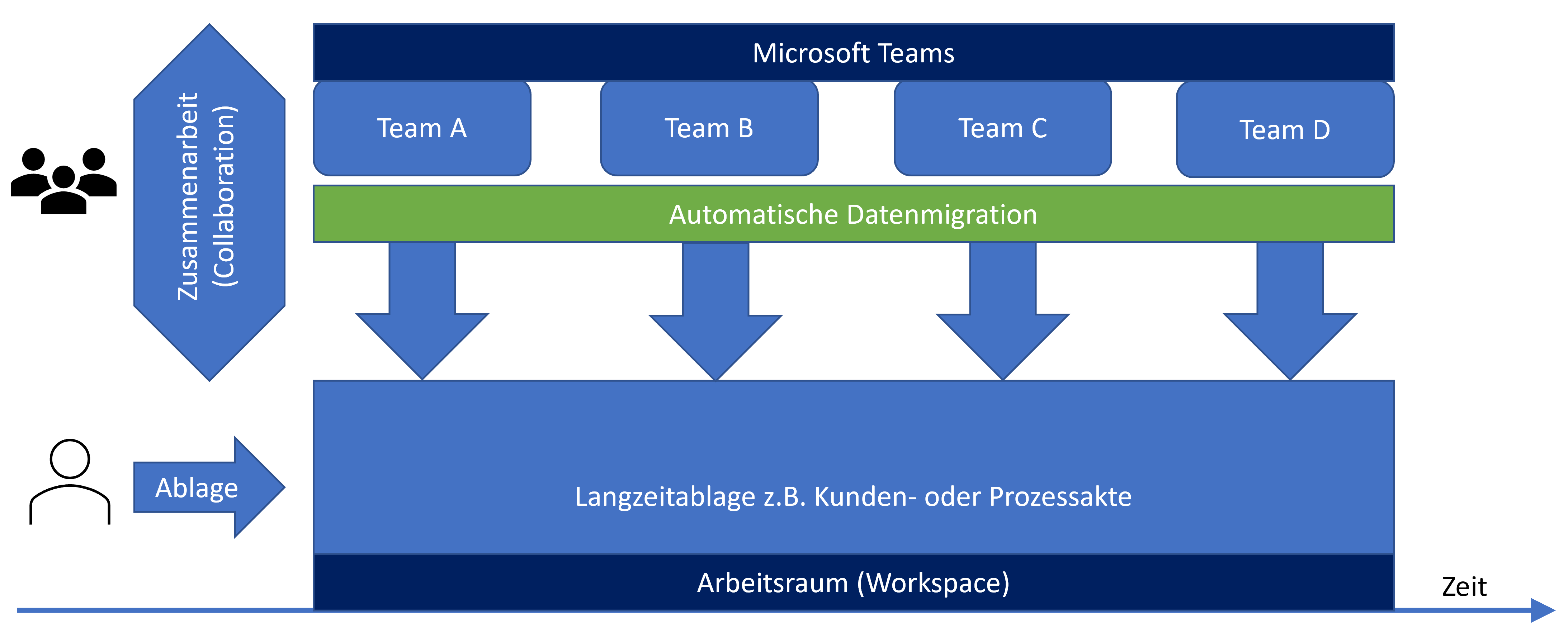 Die nachfolgende Grafik beschreibt die Zusammenarbeit mit Microsoft Teams und einer Langzeitablage (Workspace). Um kollaborativ zusammenarbeiten zu können, werden Microsoft Teams mit Bezug auf die Abteilungsakte erstellt. Nach getaner Teamarbeit wird der gesamte Inhalt vom Team in die Langzeitablage z.B. Abteilungsakte automatisch migriert.
