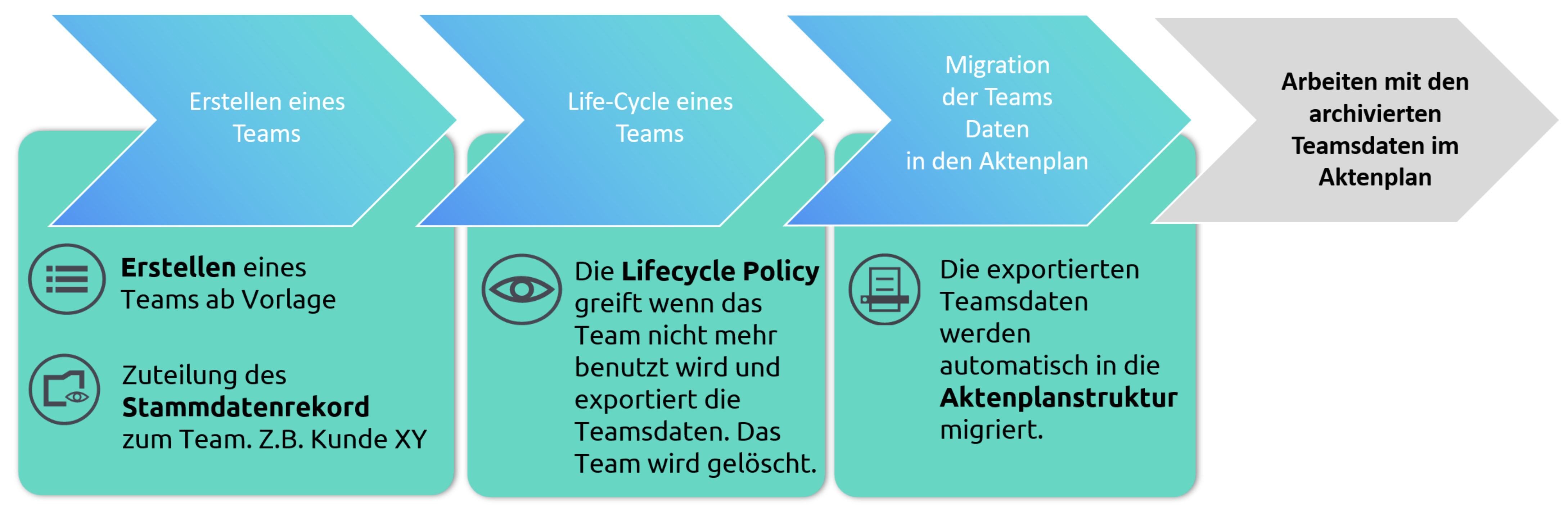 - Nach Beendigung der Teamarbeit wird der Inhalt des Teams automatisiert in die Langzeitablage migriert und das Team gelöscht.